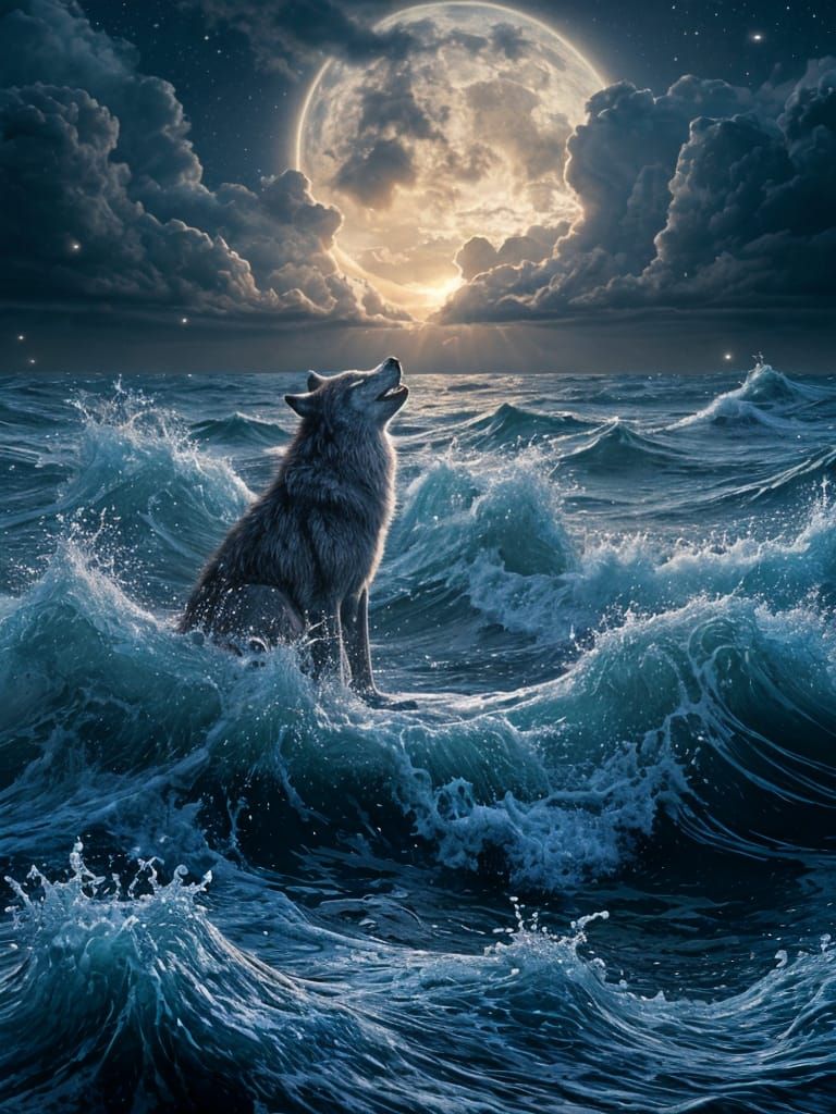 This cinematic digital artwork depicts a lone, anthropomorphic wolf adrift on stormy seas at twilight, symbolizing isolation. Luminous particles and ethereal light enhance the melancholic mood.