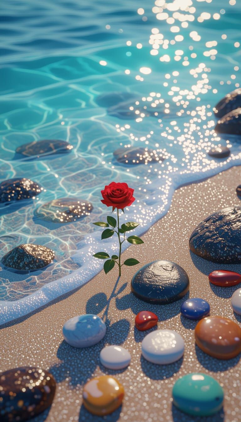 On a tranquil shoreline, where the deep blue sea kisses the horizon, multicolored stones shimmer under the sunlight, scattered like nature’s own jewels. From between these vibrant pebbles, a single red rose blooms defiantly — a delicate symbol of love rising from roughness.