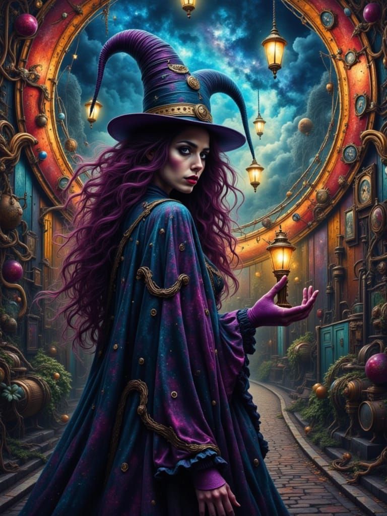 A digital artwork of Bellatrix Lestrange as a harlequin in a macabre carnival scene. The image captures a dark Victorian aesthetic with intricate textures, vibrant colors, and clockwork machinery.