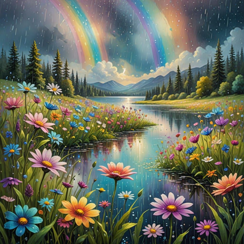A vibrant oil painting of heavy rain falling on magical flowers in a meadow by a lake. Rainbow colors fill the sky with soft, ethereal lighting and distant stars. Dreamy, serene landscape.