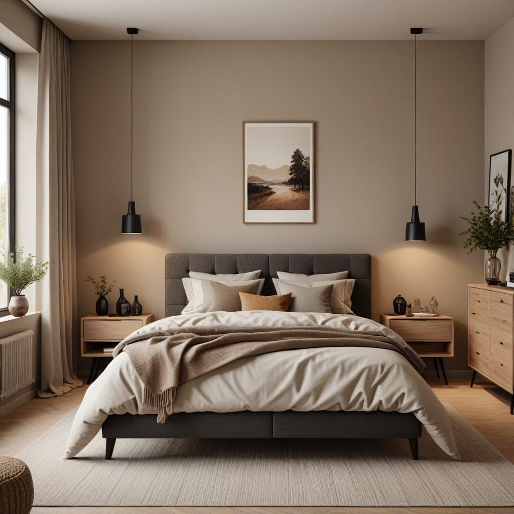 This image showcases a serene, high-end master bedroom with a focus on Dutch modern design principles. Earthy tones, wooden accents, and soft lighting create a cozy, luxurious atmosphere, while the 3D rendering brings the space to life with incredible detail.