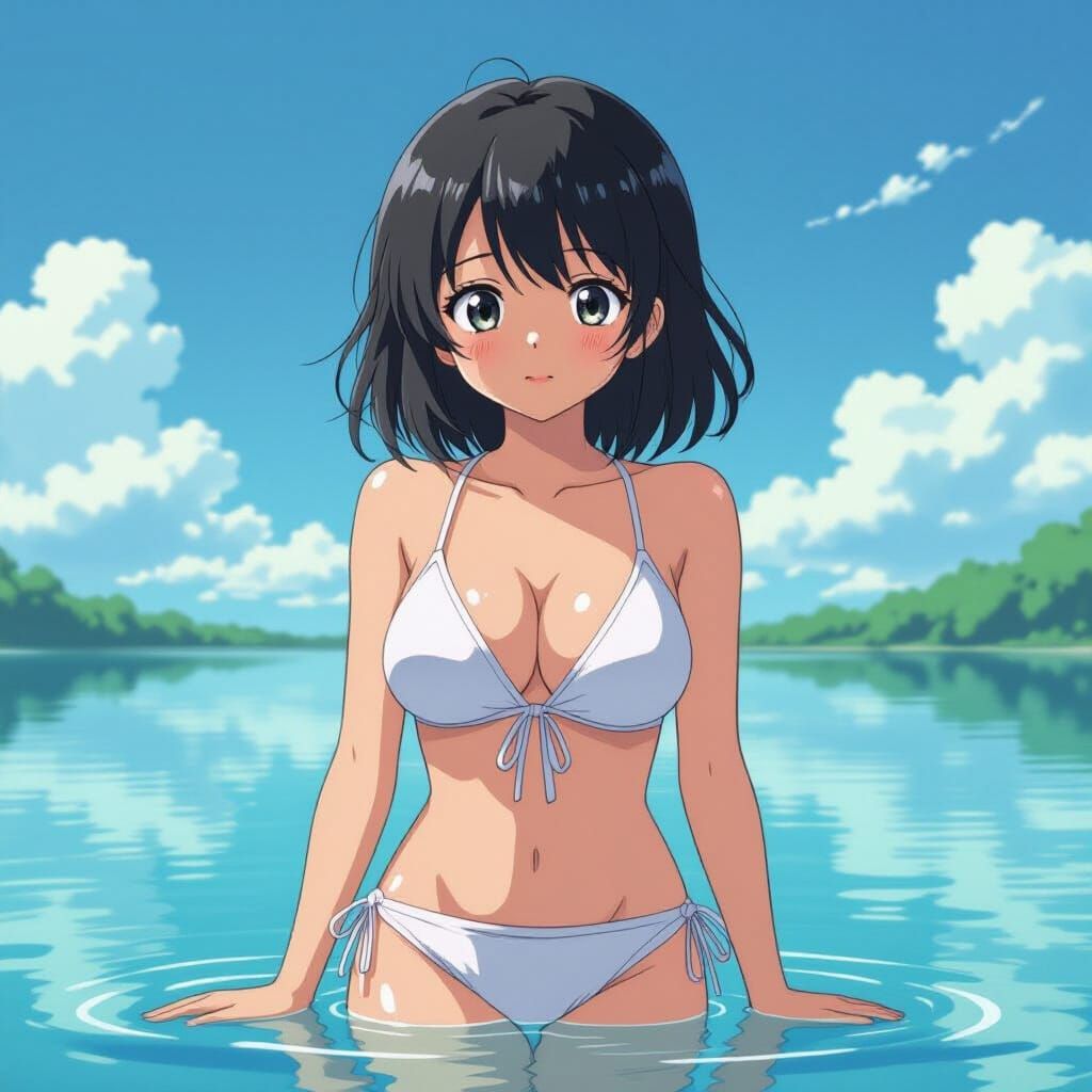 This image shows an anime girl with black hair and a slightly chubby face, wearing a wet white top and hot pants. She stands on the water, looking directly at the viewer in cel-shaded style.
