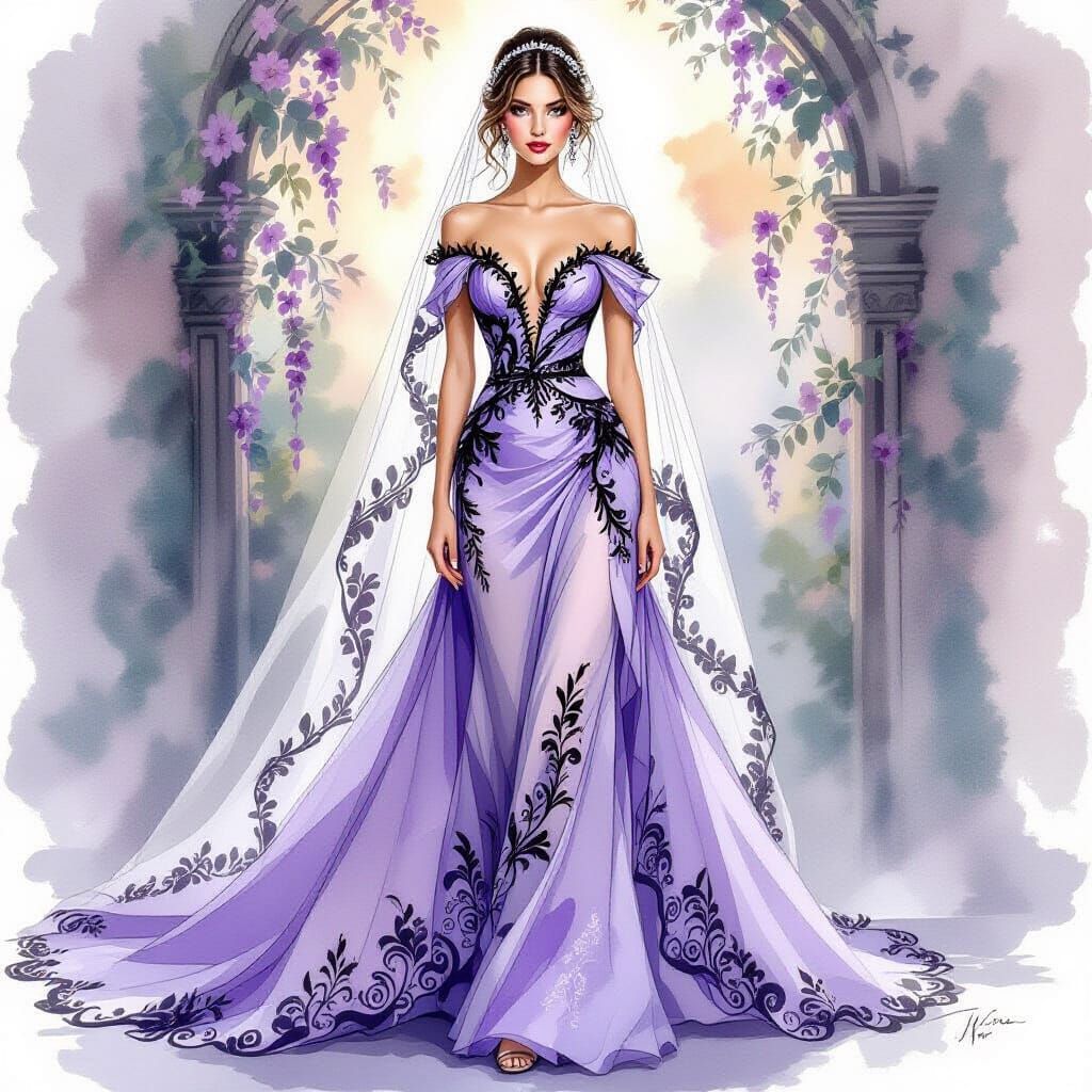 An elegant lilac wedding dress with intricate hand-drawn floral patterns and delicate beading, paired with a sheer veil. Rendered in a soft, dreamlike watercolor style with luminous lighting.