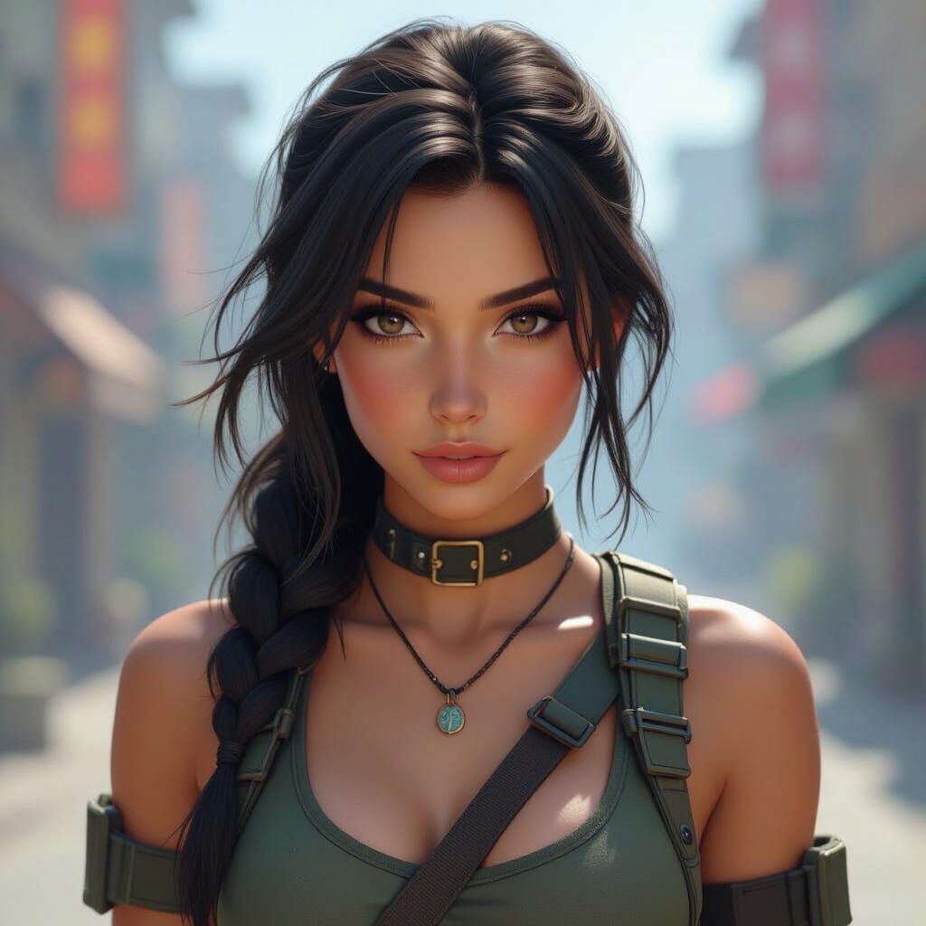 This image shows a young woman with dark hair in combat attire, rendered as a matte painting. The aesthetic is inspired by Fortnite, with intricate details and deep, complementary colors in a fantasy style.
