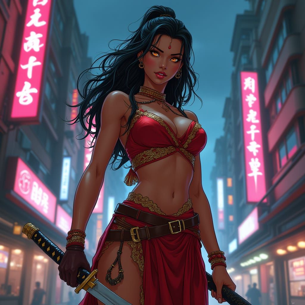This image shows a strong South Asian warrior woman standing confidently in a futuristic city, surrounded by neon lights and bold linework, inspired by digital art and comic book styles.