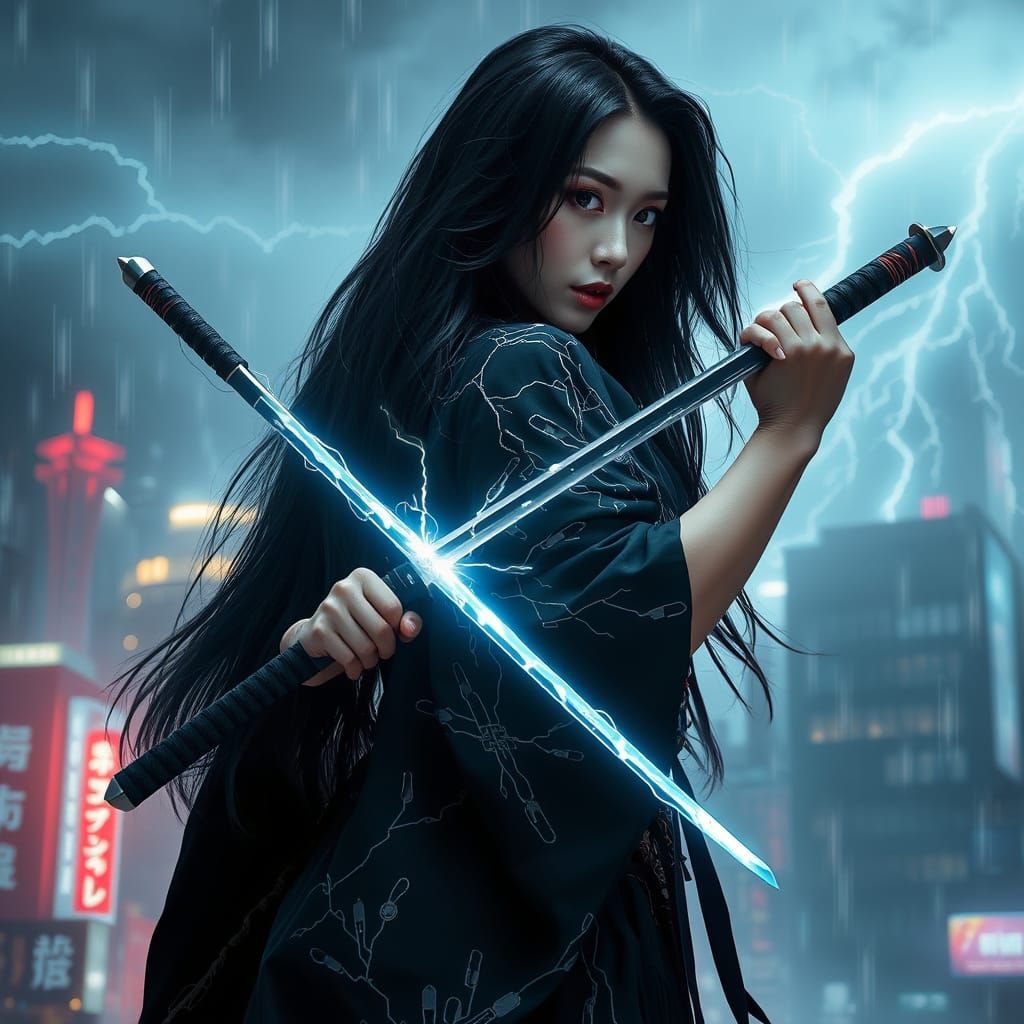 A captivating image of a woman with long black hair in a circuit-laden kimono, posed in a digital thunderstorm with katana. Retro glamour meets cyberpunk in cinematic style.