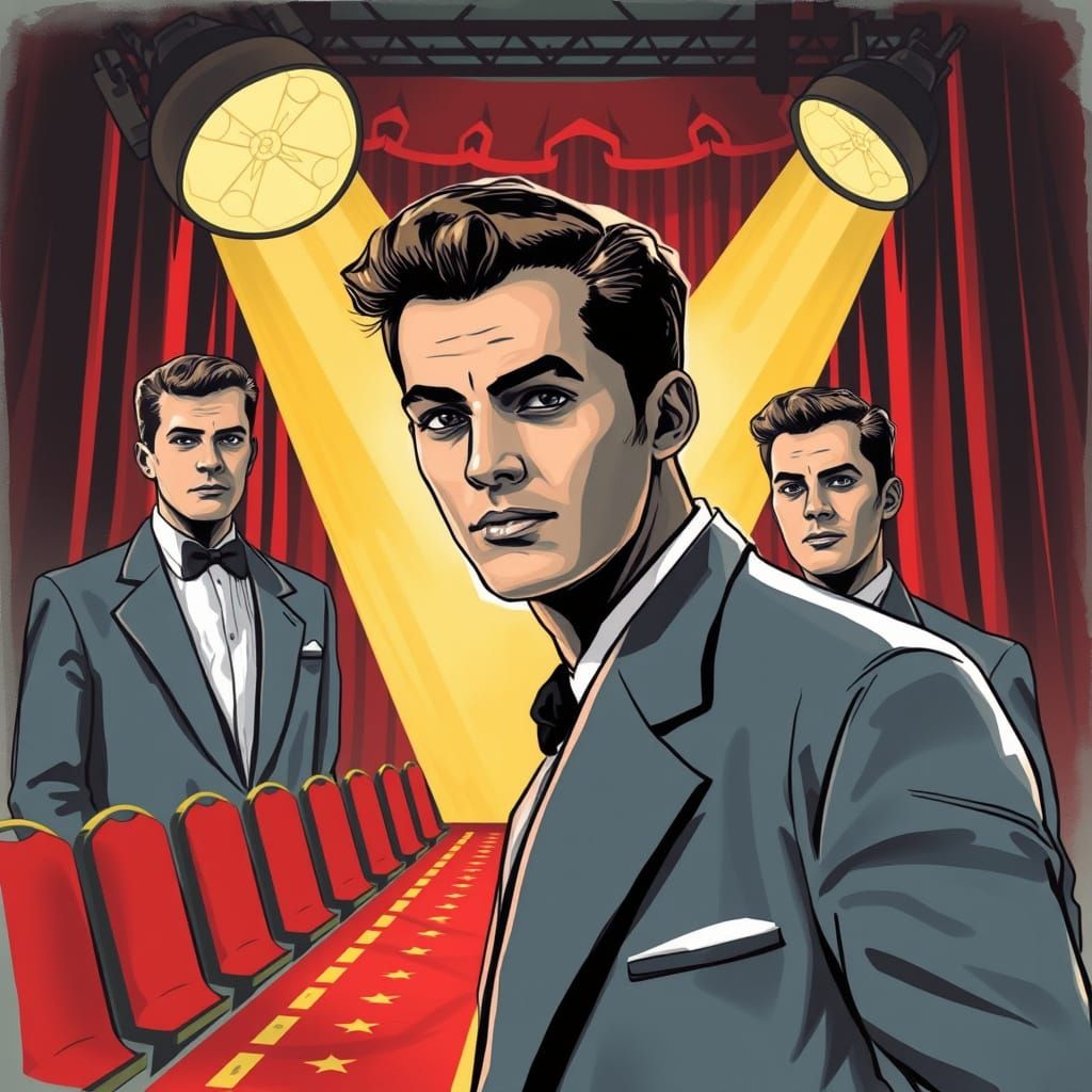 A striking picture of a man in vintage fashion. The portrait evokes a 1950s studio aesthetic, complete with dramatic lighting and a vintage theater runway with red curtains.