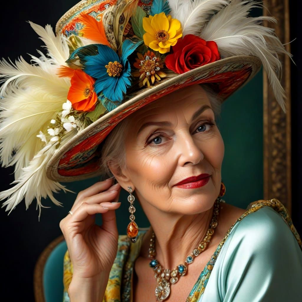 surreal incongruous fanciful whimsical scene with unexpected arrangement of incompatible elements in absurd bizarre composition; full-height image of lively magnetic captivating mature lady elegantly dressed in unusual multicolored retro-style outfit, natural graceful dynamic posture, ease of movement, ...