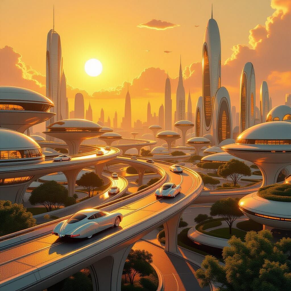 This image depicts a panoramic utopian city vista, bathed in warm orange light. Sleek, soft-chrome vehicles travel on elevated paths, showcasing a vintage futuristic design. The scene is rendered in a vibrant Retro Futurism style.