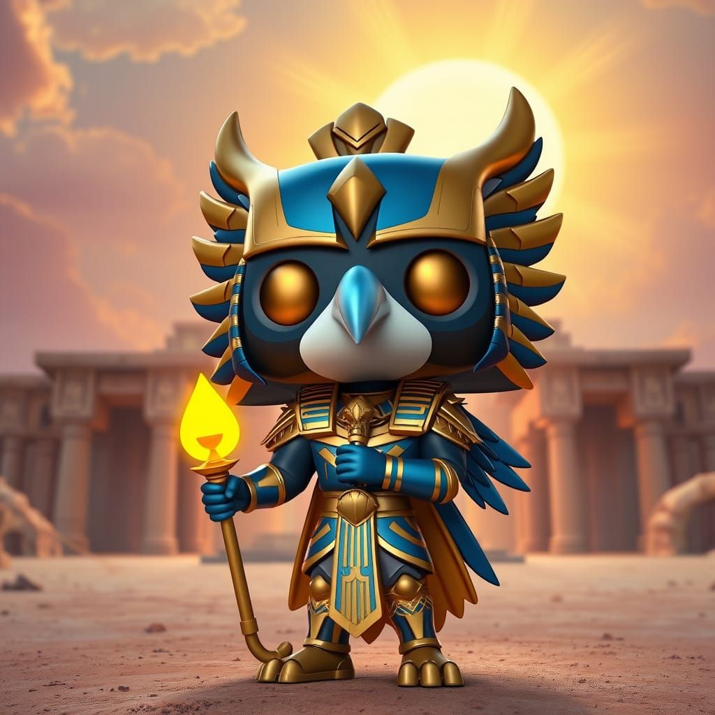 Junko Pop figure of Horus with an oversized falcon head, large cartoonish golden eyes, and a compact body in detailed blue-and-gold armor. He holds a glowing ankh staff and has stylized gold-feathered wings folded behind him. The figure stands in front of a stylized ancient desert temple with a radiant sun disk glowing in the sky.