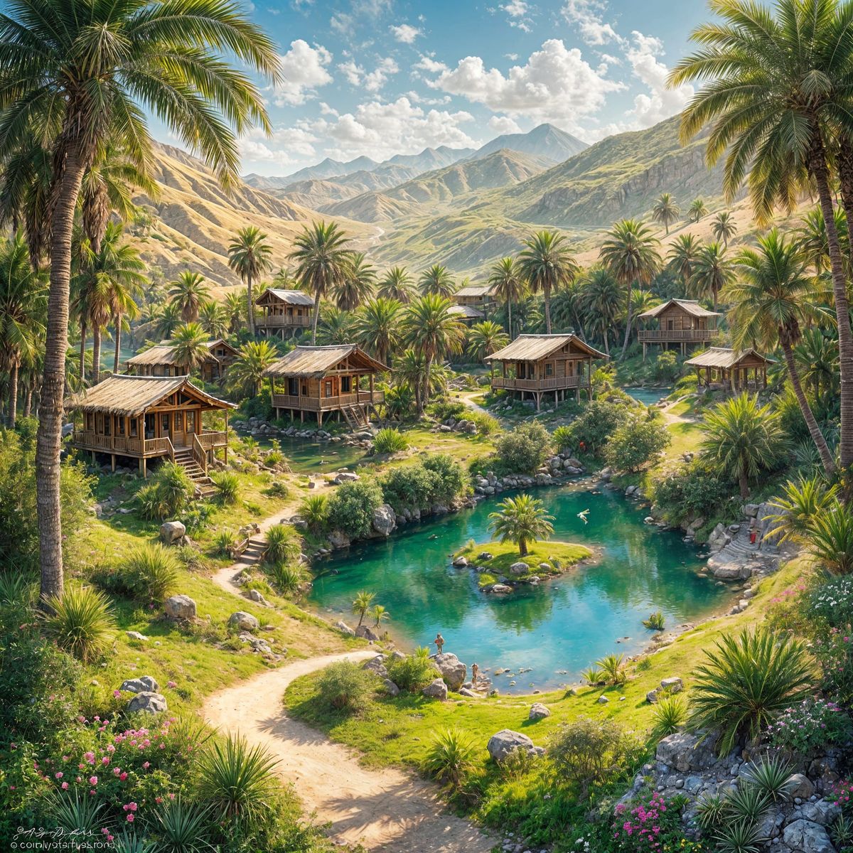 This image depicts a lush desert oasis with palm trees, a crystal-clear lake, and a stone shrine on a central island. Wildlife thrives around the village.