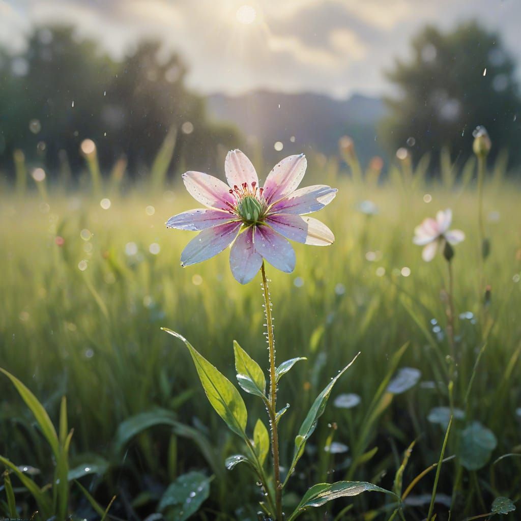 A serene watercolor painting of a flower in a field, bathed in soft sunlight. Gentle raindrops adorn the petals, with blurry green grass creating a dreamy, ethereal atmosphere in pastel tones.