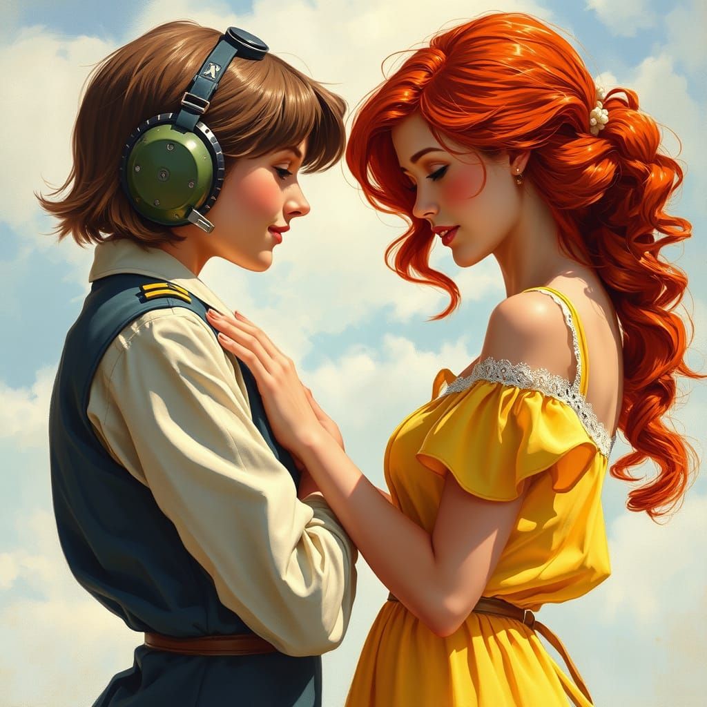 This image shows two young women in a loving embrace, one in a pilot's uniform and the other in a summer dress, sharing vows in a heartwarming scene. The image is reminiscent of romantic realism.