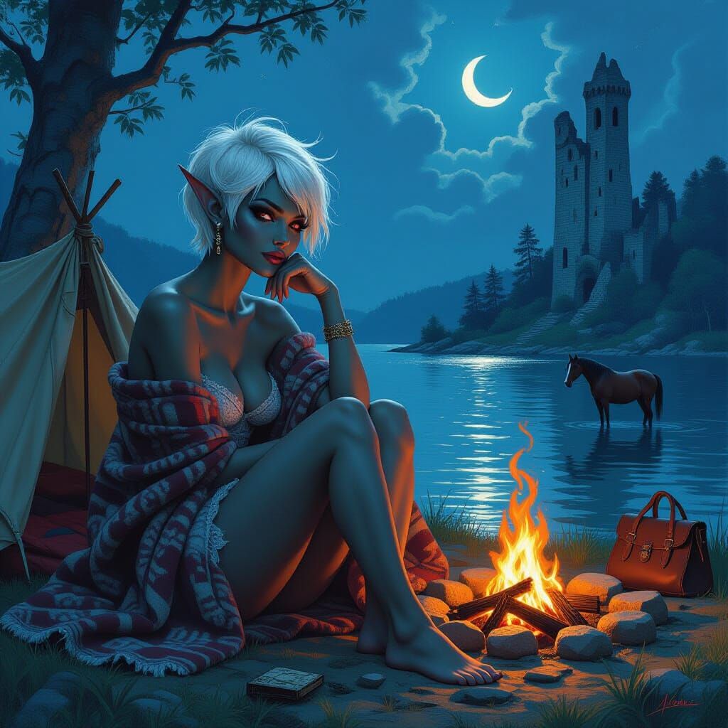 This image shows a dark elf woman seated by a campfire at night. The art style evokes fantasy oil paintings, with a focus on texture and dramatic lighting, in a painterly style.
