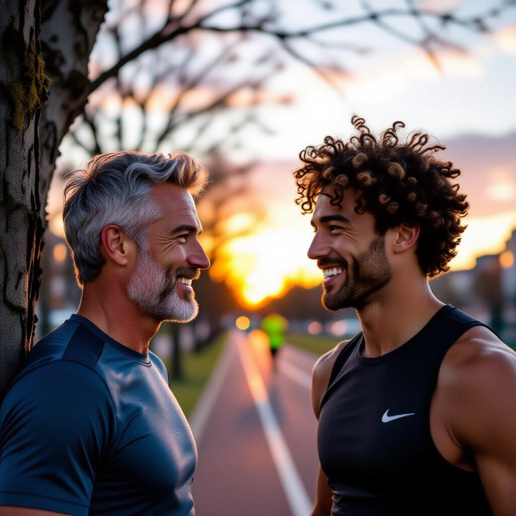 This image shows two athletic men after a run, sharing a joyful moment at sunrise. The scene evokes a high-fashion editorial with warm lighting and a film-like aesthetic.
