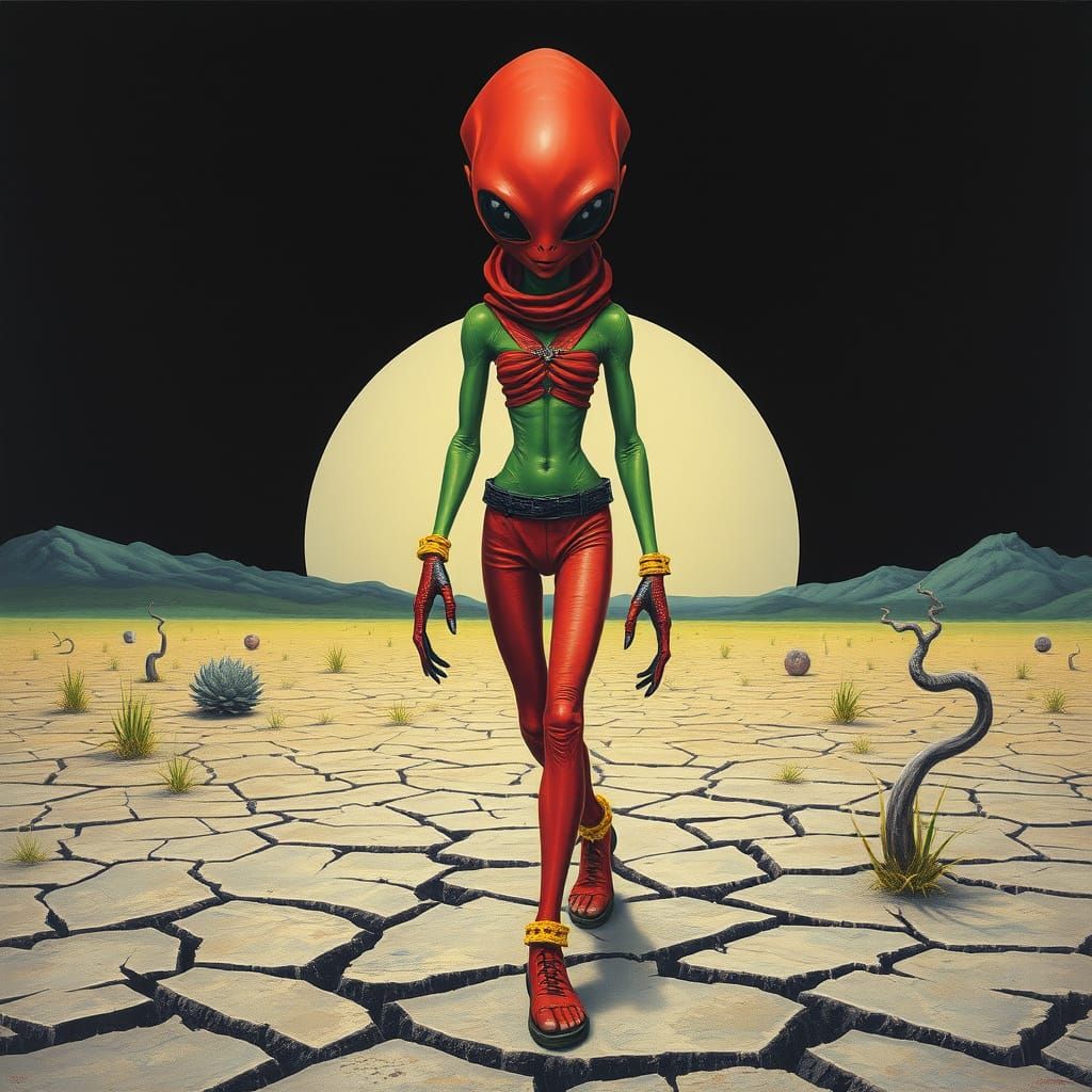 A surreal image of an alien figure in red and green walking across a parched field. The artwork features bold colors and a striking black backdrop, reminiscent of surrealist art.