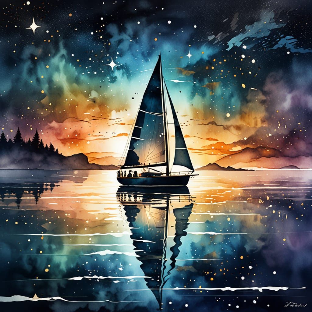 This dreamy watercolor painting captures a sailboat crossing the ocean under a starry night sky, with a galaxy pattern on the boat and soft brushstrokes that evoke a sense of ethereal wonder.