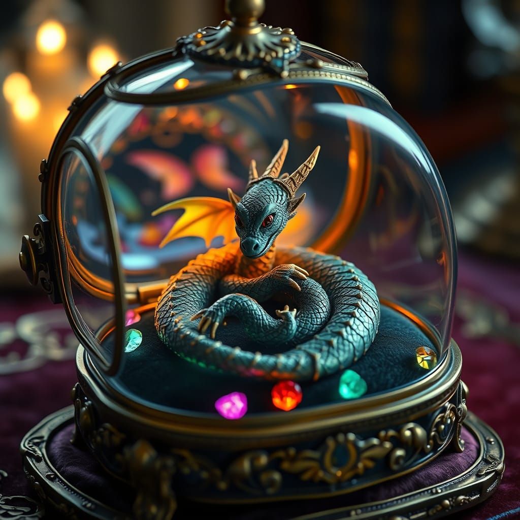 A captivating image of a tiny dragon asleep inside a glass jewelry box filled with radiant gems. The dragon's scales shimmer with iridescent colors, reminiscent of Studio Ghibli's animated style.