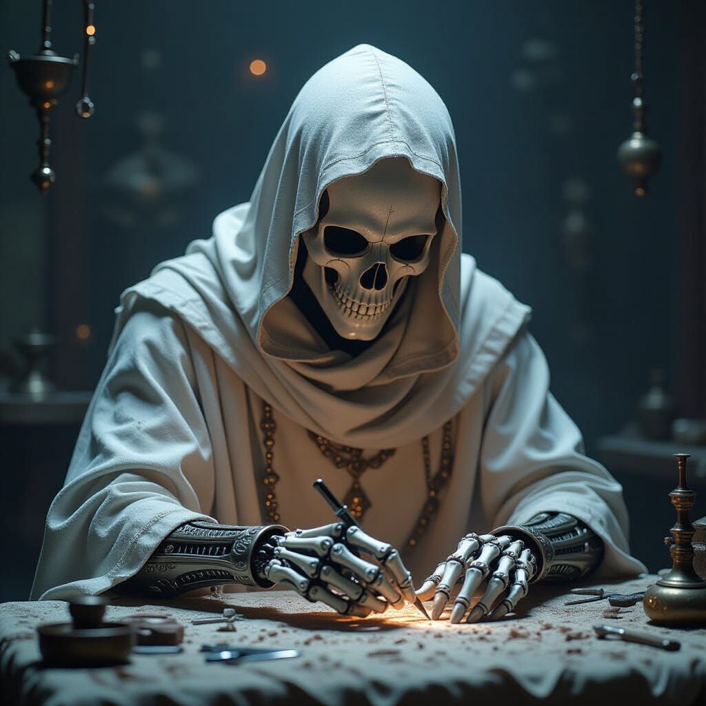 This gothic fantasy concept art depicts a bonewright with a steel forearm graft, wearing soot-streaked robes with metallic thread. A skull mask obscures their face, in a dramatic, shadowed atmosphere.