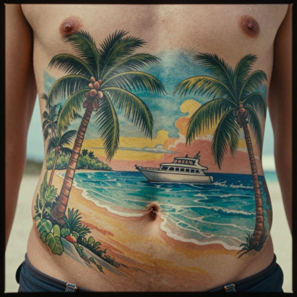 This image showcases a detailed stomach tattoo of a tropical beach with palm trees and a yacht, rendered in a cinematic, film-like style with rich color grading.