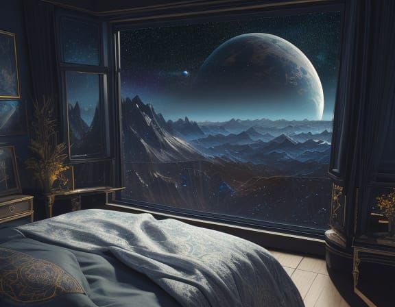 This stunning image shows a breathtaking view of outer space from a bedroom window, rendered in exquisite detail and vibrant color, creating a truly fantastical and intricate scene