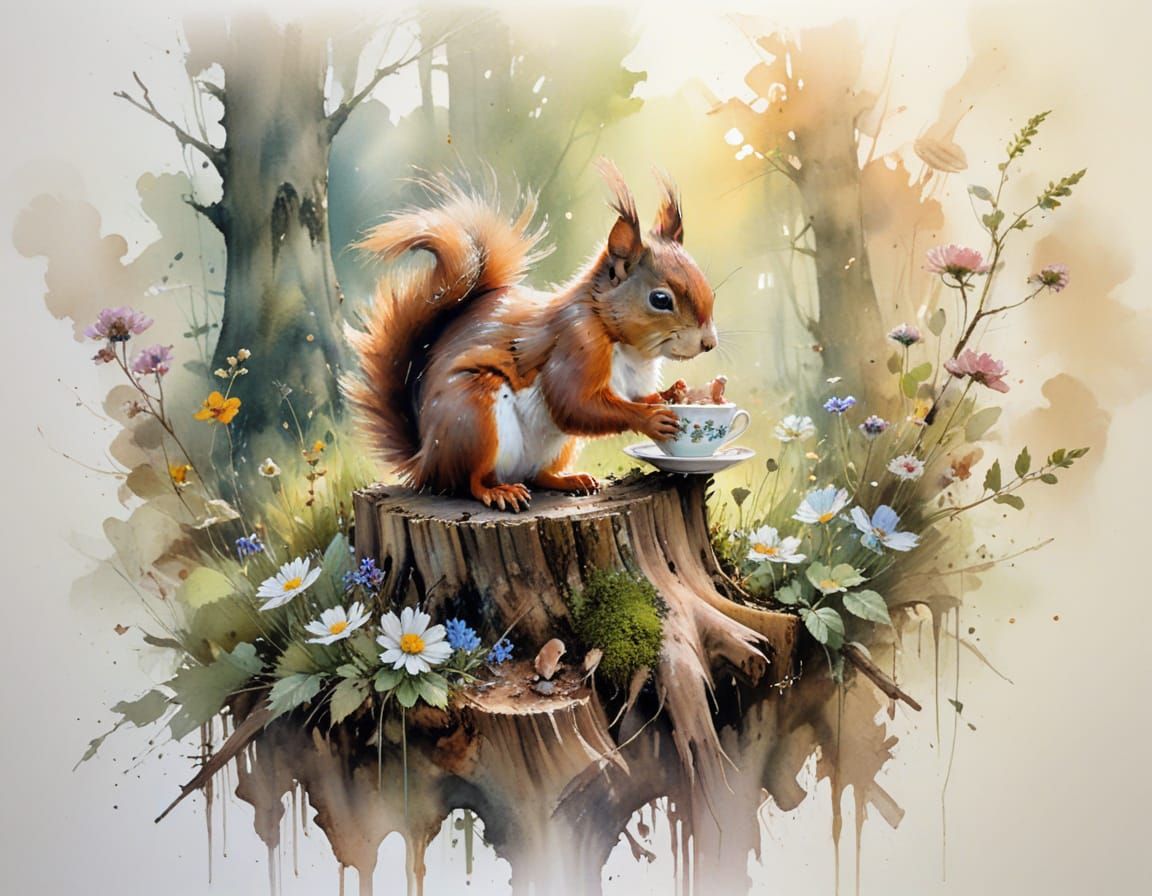 This image shows a red squirrel holding an acorn like a teacup on a tree stump. It features realistic fur and expressive watercolor effects in a warm, golden light.