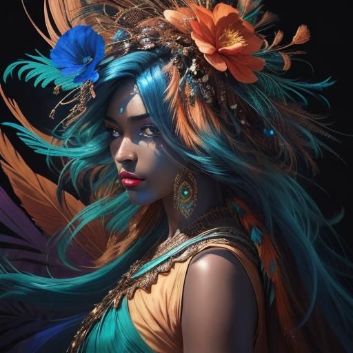 A striking portrait of a woman with peacock feathers in her bright blue hair. This hyperrealistic image features a soft, colorful glow, intricate textures, and refined details inspired by comic art.