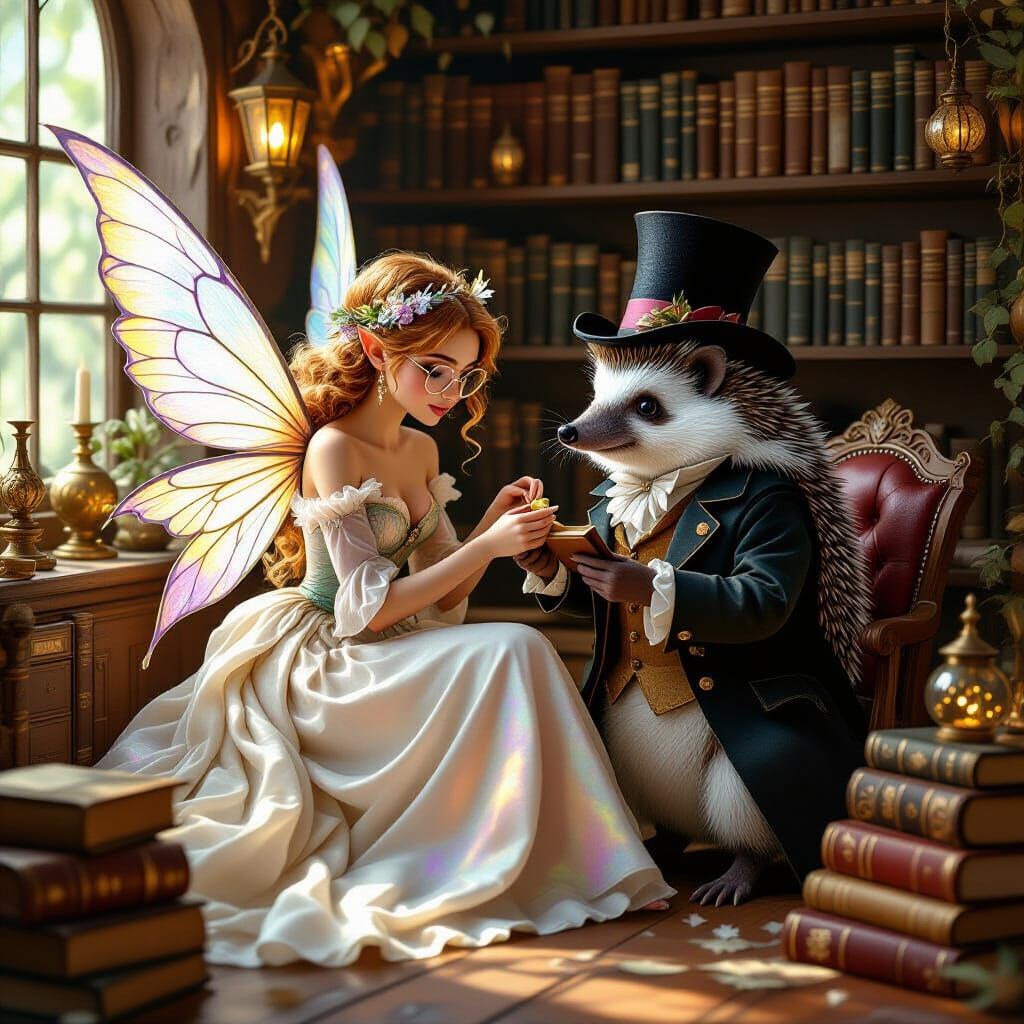 A charming image shows a fairy having her wing repaired by a hedgehog in a workshop. The scene is filled with magical elements and rendered in a detailed, mystical style.