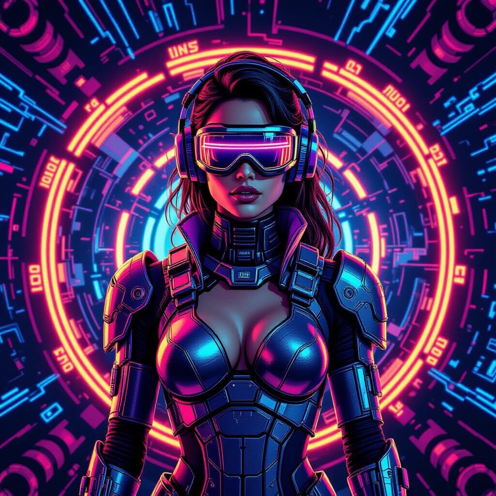 This image shows a cybernetic woman in neon-lit armor and goggles. The backdrop features steampunk gears and neon circuits, rendered with bold lines and technicolor hues in a cyberpunk aesthetic.