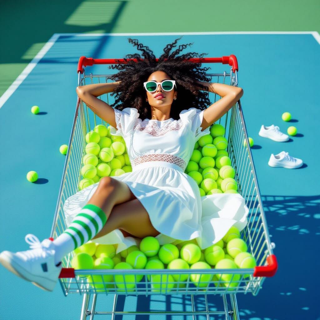This image shows a woman in a white dress and sunglasses lounging in a shopping cart full of tennis balls on a blue tennis court. The image captures a sunny, cinematic, and sporty moment.