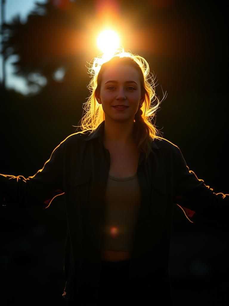 A captivating waist-up portrait of a Swedish woman in silhouette. Shot outdoors in warm colors and reminiscent of candid cinema with a color graded film effect.