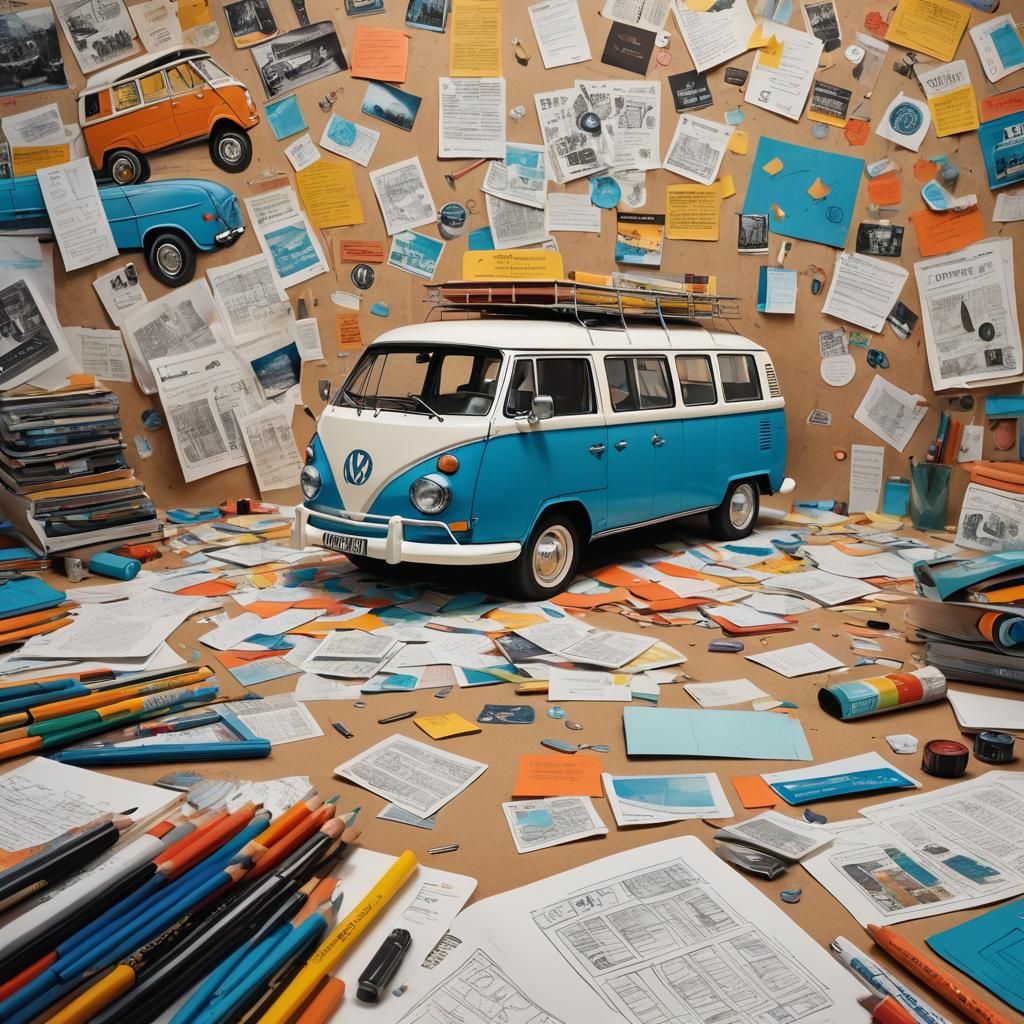 This image shows a person planning a camper van conversion. The classic VW van is covered in vibrant sketches and notes, surrounded by scattered papers and art supplies in a whimsical and adventurous scene rendered as concept art.