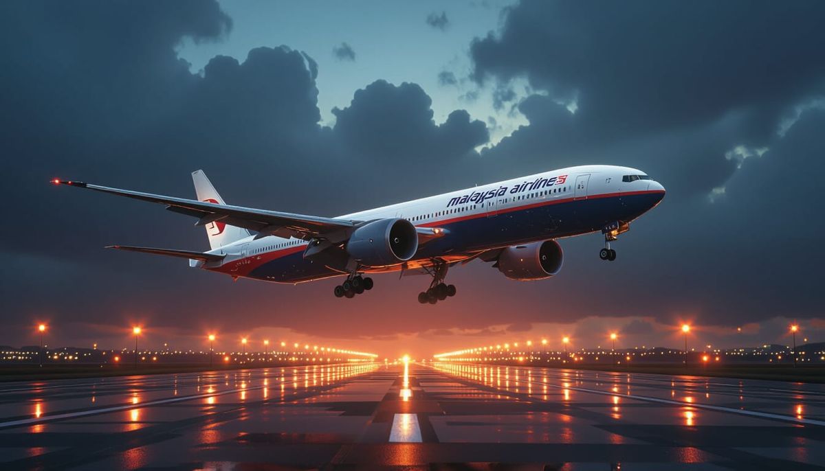 A captivating image showing a Malaysia Airlines Boeing 777 taking off at night. The plane is lit by runway lights against a cloudy sky, with cinematic lighting effects and a high-contrast, detailed aesthetic.