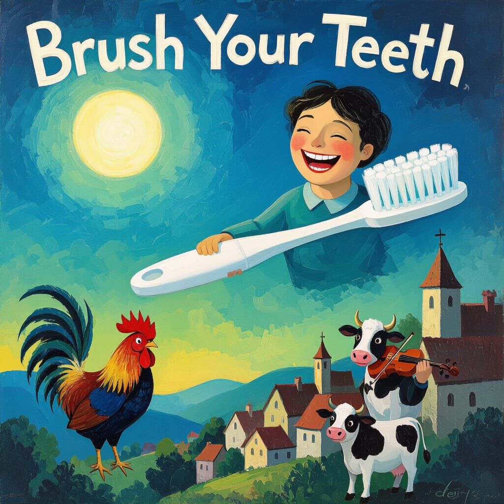 This image depicts a dreamlike scene of a smiling person brushing their teeth with a glowing toothbrush above a village. It features vibrant colors and painterly brushstrokes, reminiscent of expressionism.