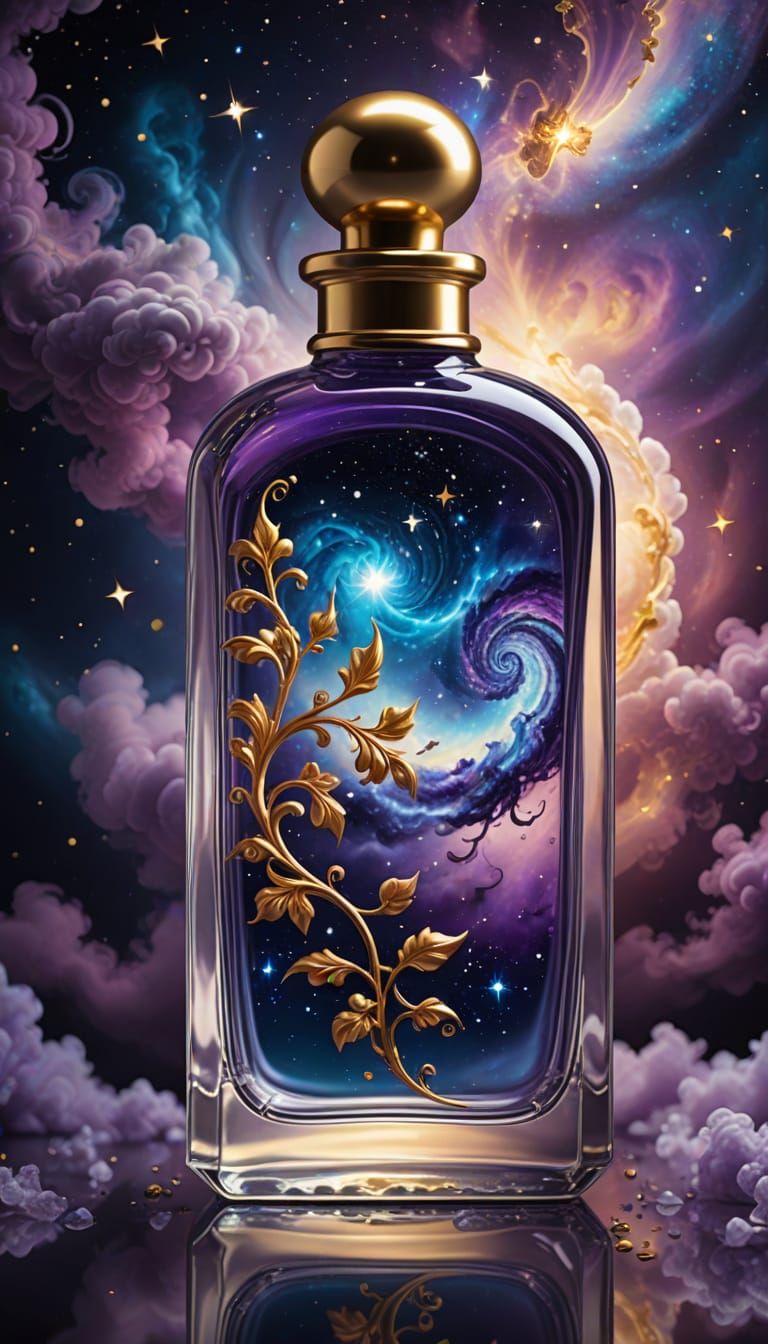 This enchanting image showcases a luxurious, hyper-realistic digital art piece featuring a stunning oriental glass perfume bottle with a magical, whimsical galaxy inside and radiating outwards, set against a rich blue and purple background with golden stars and delicate glasswork details.