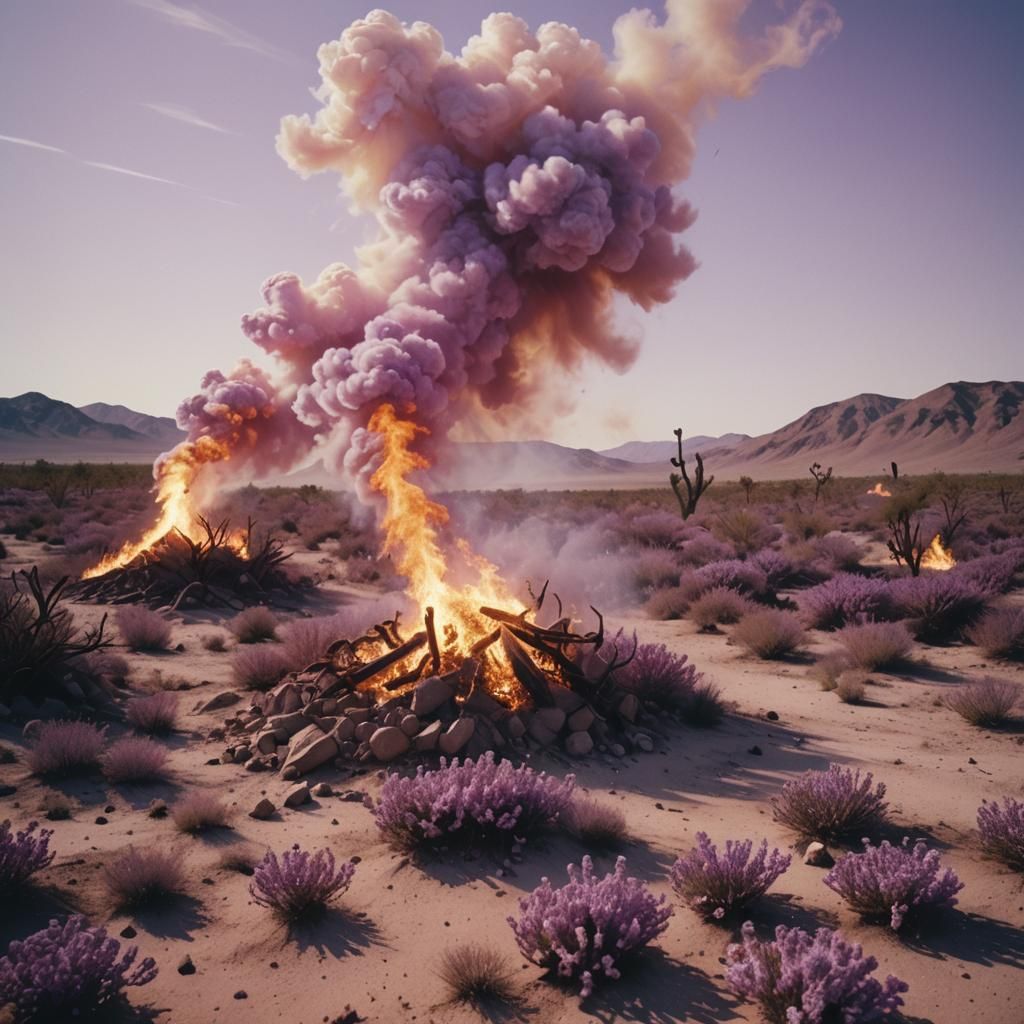 This image shows a desolate desert landscape engulfed in lilac flames, set beneath a matching lilac sky and a blazing white sun. The scene is rendered with cinematic film textures and vibrant colors.