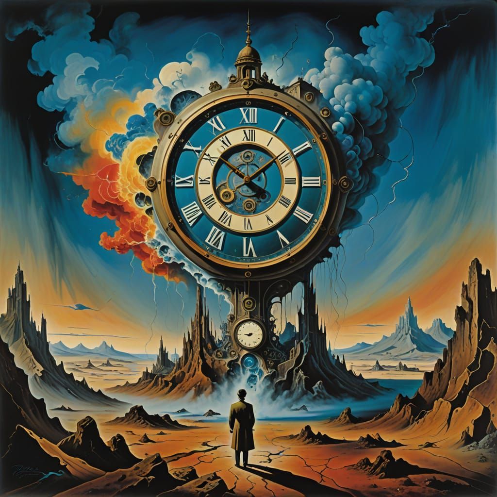 This image depicts a lone figure in a dreamlike, surreal landscape where architecture crumbles and reality dissolves into abstract shapes and cosmic dust, evoking an unsettling and introspective mood.