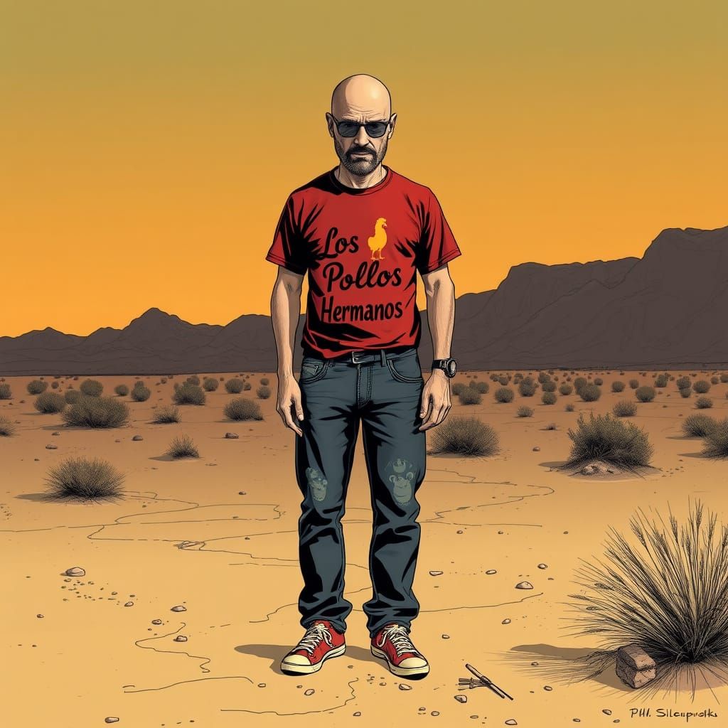 This image shows Walter White in a Los Pollos Hermanos t-shirt against a desert backdrop. Rendered in a graphic noir style, it features bold lines and muted colors.