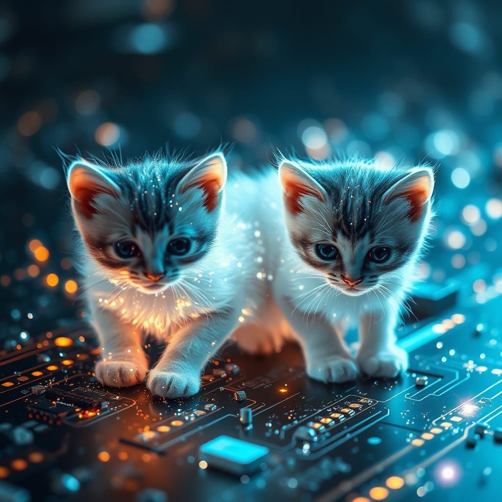 This image shows kittens on a glowing circuit board with glass particle effects. The artwork is a hyperdetailed digital illustration with a futuristic, surreal cyberpunk aesthetic.