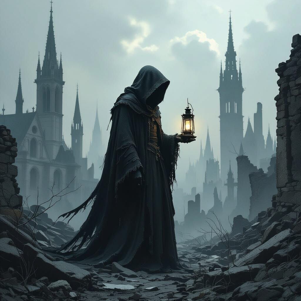 A lone spectral figure stands amidst the ruins of a gothic city, clutching a single, flickering lantern. The cityscape is rendered in hyperrealistic concept art, with dramatic chiaroscuro lighting casting long, eerie shadows. The atmosphere is dark and hauntingly beautiful, reminiscent of classic horror ...