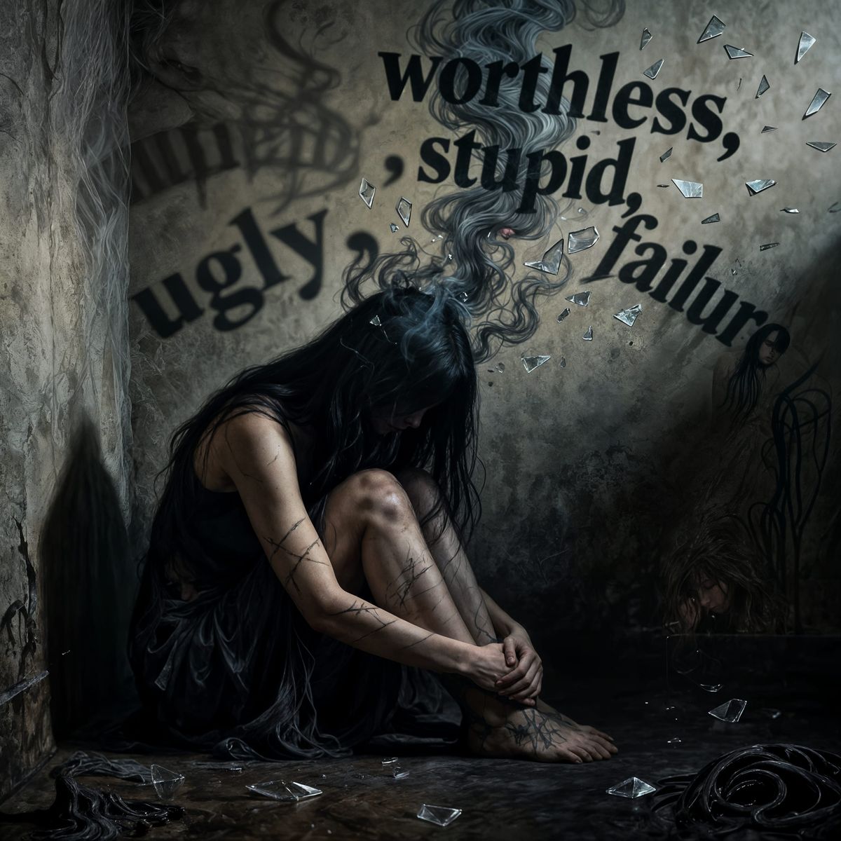 This image shows a faceless woman in a dimly lit corner, surrounded by shadowy, distorted words symbolizing inner suffering. Rendered in a dark, symbolic surrealist style with deep shadows.