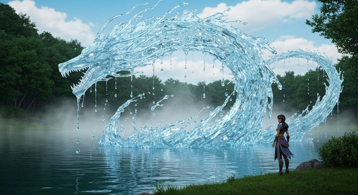 A hyper-detailed 3D anime artwork depicts a translucent water dragon rising from a lake beside Avatar Korra. Cinematic lighting and vibrant colors create a realistic fantasy scene.