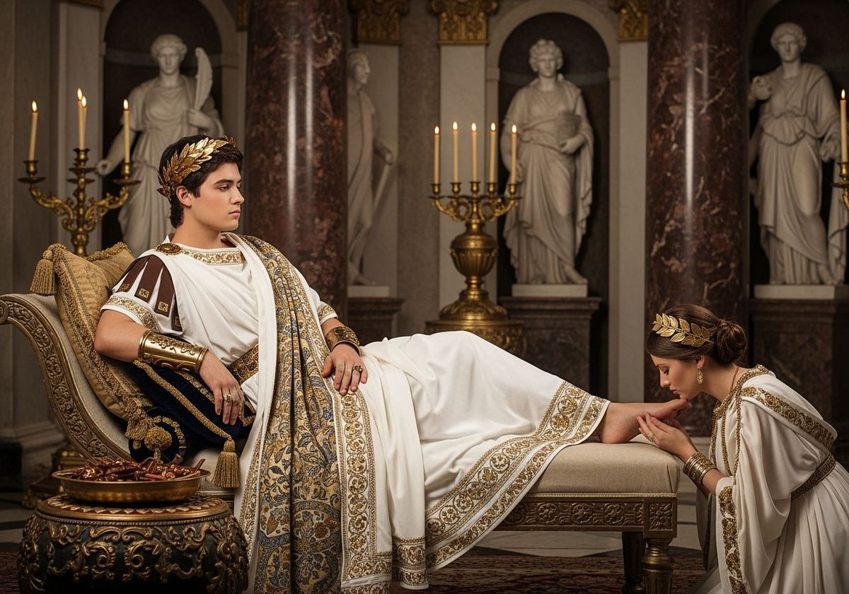 This image shows a young Roman emperor relaxing in his palace. He is wearing a white and gold toga and is surrounded by luxury. A priestess kneels before him in this photograph-like image.