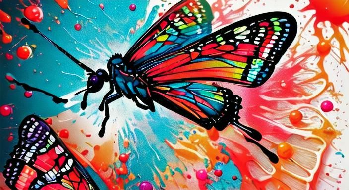 This image shows a vibrant, cartoon-style unicorn with butterfly wings in a colorful garden. The artwork blends hyperrealism with playful cartoon elements.