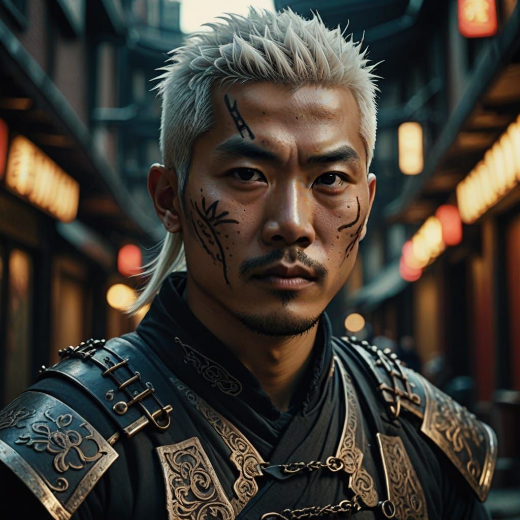 This image shows a hyperrealistic close-up of a Chinese assassin with spiked white hair and intricate face tattoos. The subject is wearing a vibrant, traditional-inspired costume and is depicted in cinematic lighting.