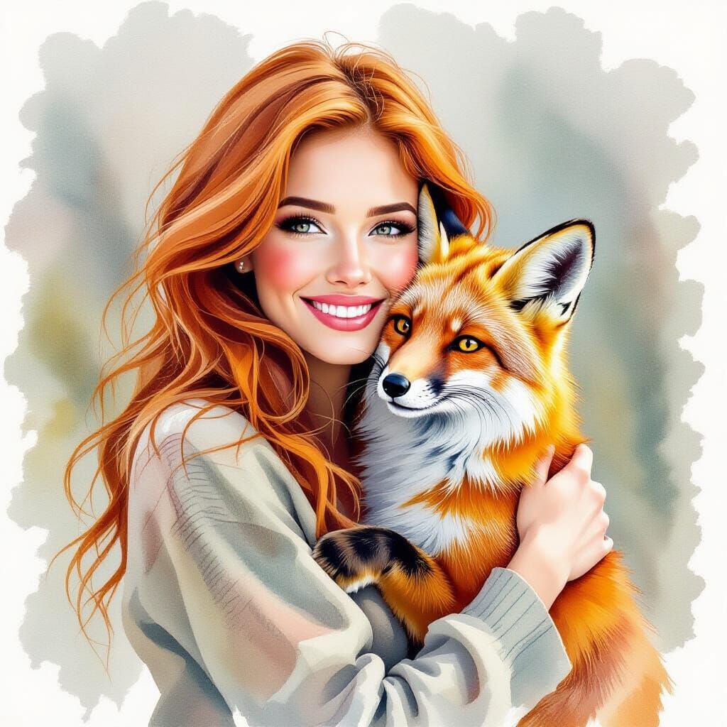 This realistic watercolor painting features a smiling redhead woman gently holding a beautiful fox in her arms. The artwork showcases a soft, painterly style.