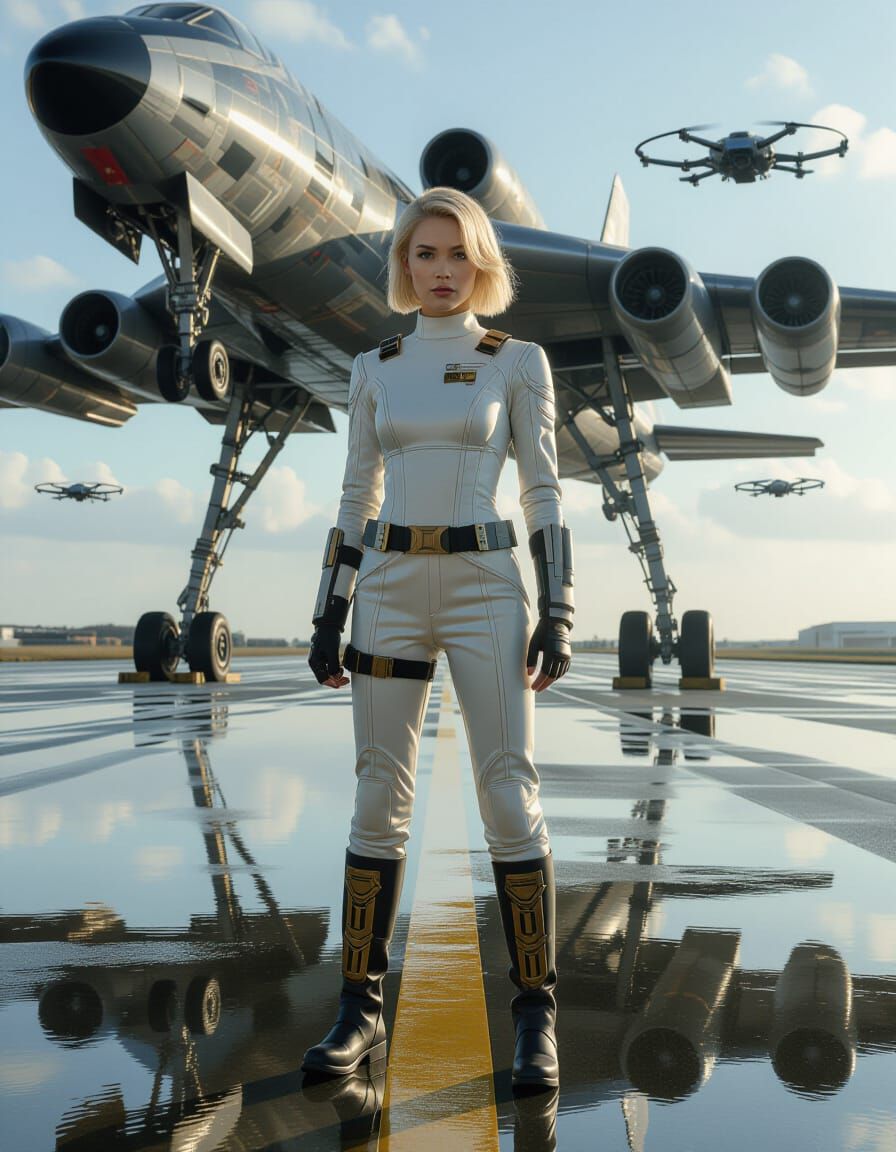 This image shows a confident young female sci-fi pilot standing on a wet airstrip. Colossal retro-futuristic aircraft tower in the background, with hovering drones. The scene is lit with dramatic sunlight, rendered with cinematic color grading.