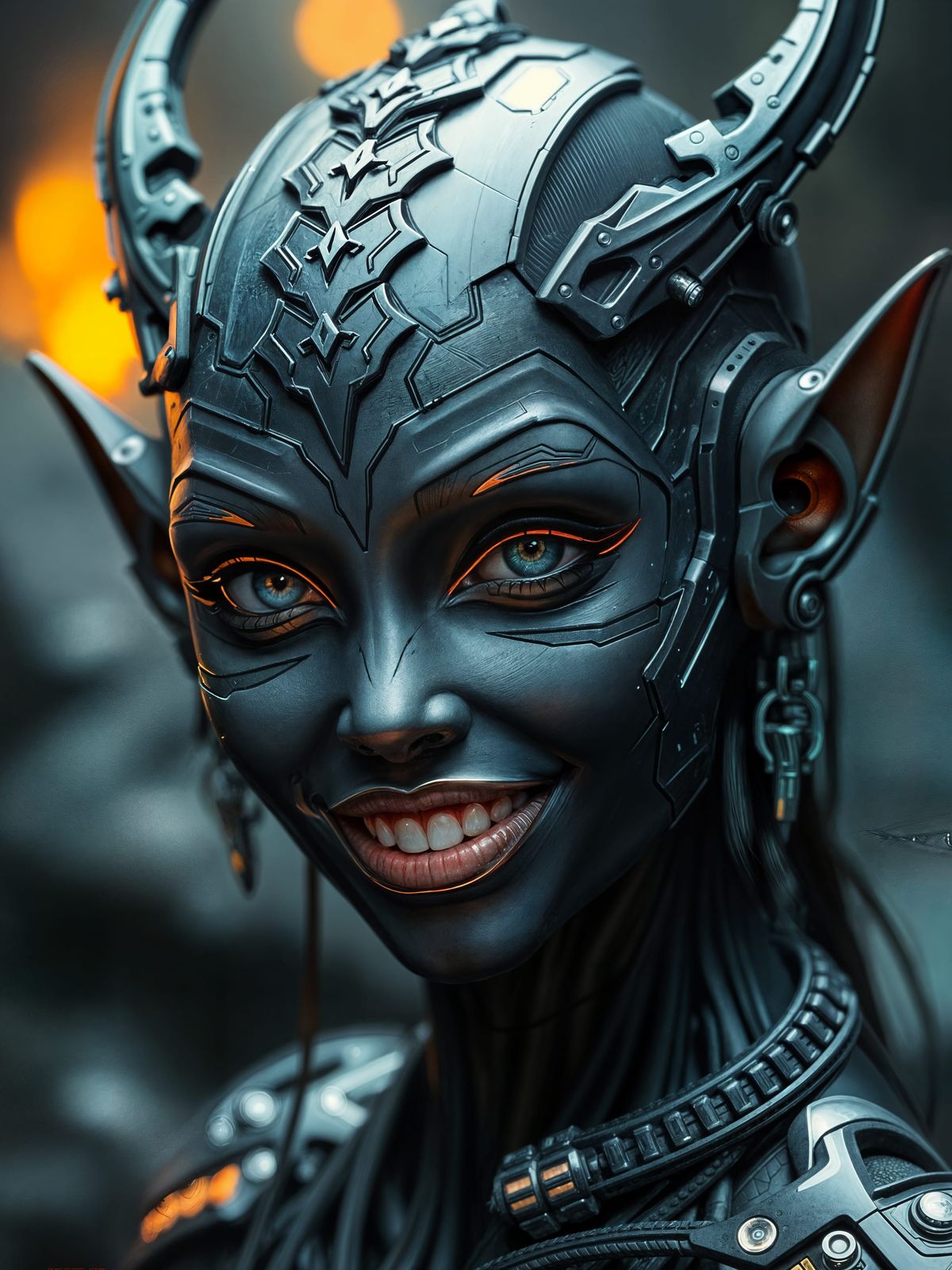 This image showcases a cyberpunk-inspired digital painting of a cybernetic elf with intricate details, set against a dramatic and atmospheric backdrop.