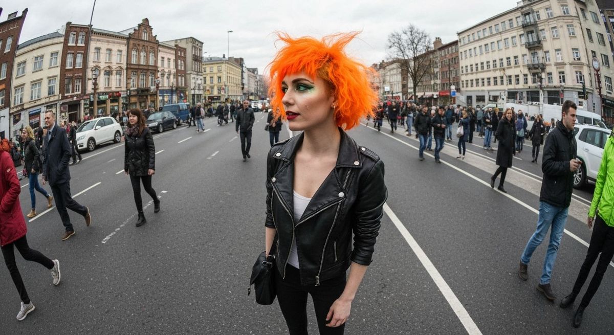 This image shows a vibrant gyaru girl in a Japanese street style. The photo captures the energy with a wide-angle lens, emphasizing her bright, unique hairstyle and the urban scene.