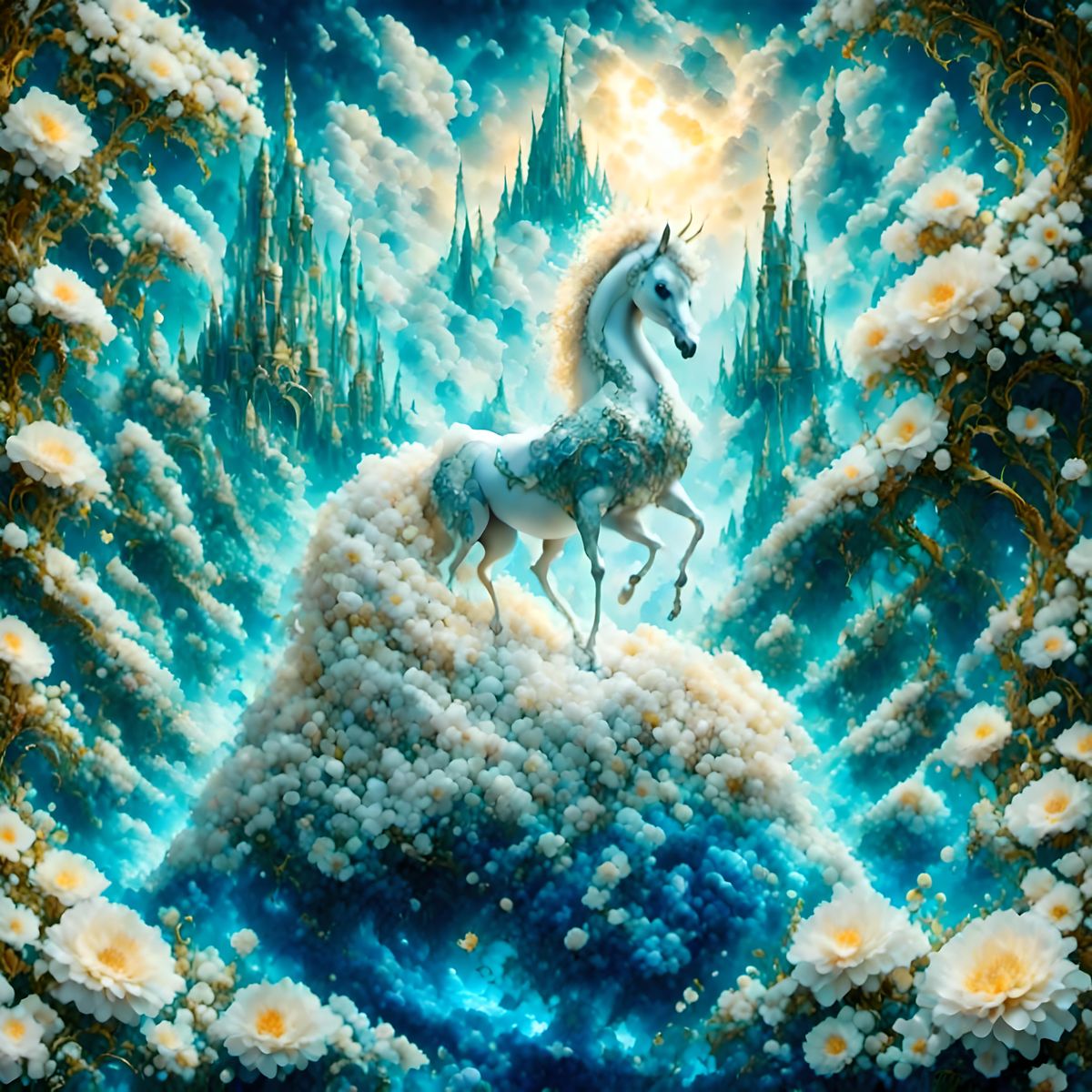 An enchanting AI-generated fantasy landscape. The image shows a surreal wonderland with whimsical cloud creatures and glass-like spheres, rendered as digital art.